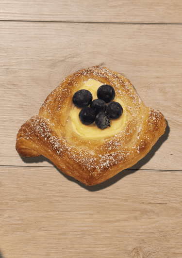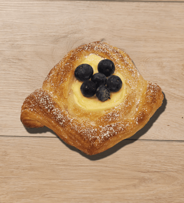 Enjoy our flaky Danish, brimming with creamy vanilla custard and topped with fresh blueberries, dusted with powdered sugar.